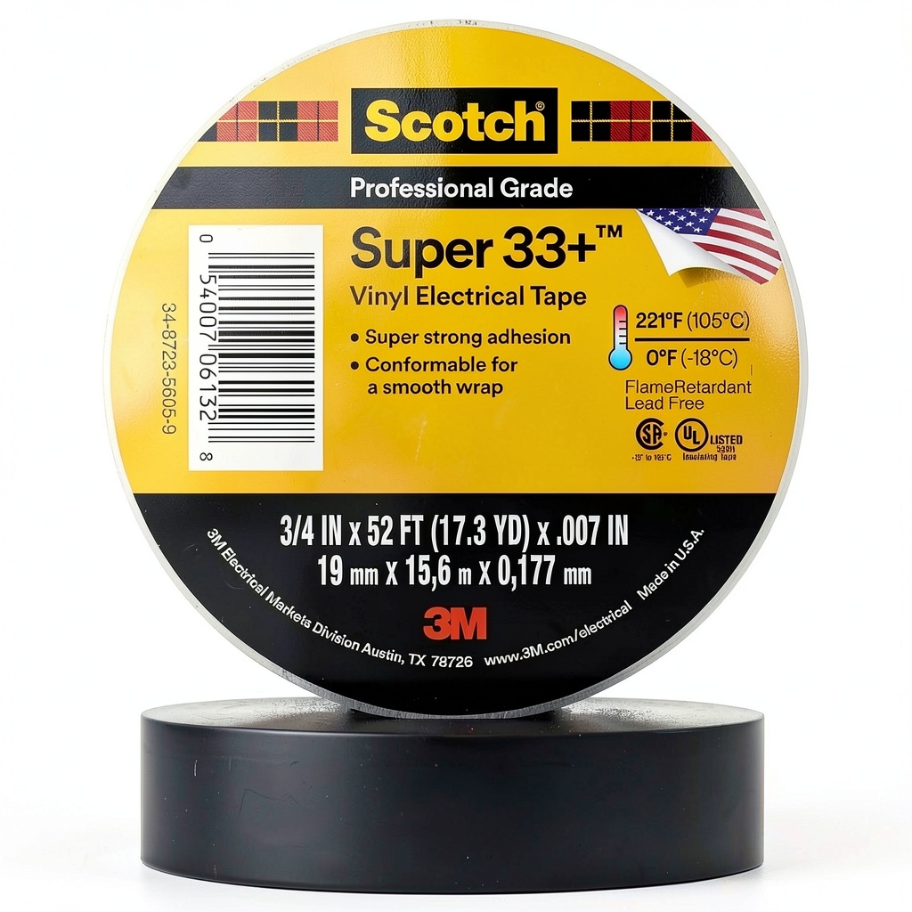 3M Professional Grade Electrical Tape is engineered for demanding industrial and maintenance environments, providing superior electrical insulation and mechanical protection. This tape features a highly conformable PVC backing combined with a rubber-based adhesive, ensuring a secure, moisture-tight seal that withstands temperatures from 0 to 221°F. It is designed for above and below grade applications, both indoors and outdoors, and is compatible with various cable insulations and splicing compounds. Key specifications include CSA certification, UL listing, and compliance with IEC 60454-3-1-7/F-PVC P/90 standards, making it a reliable choice for low and high voltage electrical work.