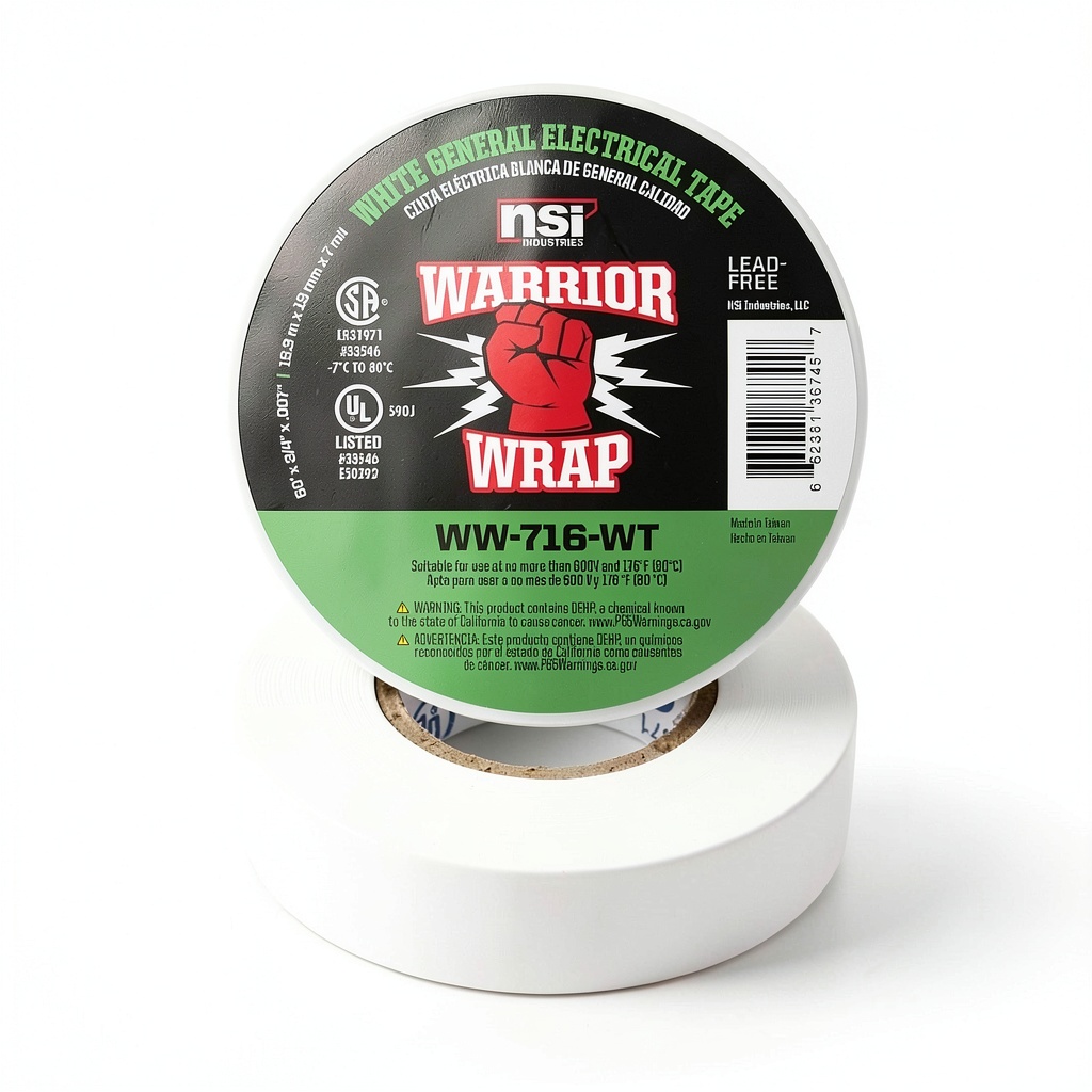 NSI electrical tape is engineered for secure protection in demanding environments, withstanding all weather conditions while maintaining strong adhesion and flexibility. Made from high-quality materials, it offers excellent elongation and durability, making it ideal for electrical insulation and bundling. Key specifications include product dimensions of 2.87 x 2.87 x 0.75 inches, a weight of 2.4 ounces, and model number WW-716-WT. Manufactured by NSI Industries, this tape is flame retardant and resistant to UV exposure, abrasion, and corrosion, ensuring reliable performance in various applications.